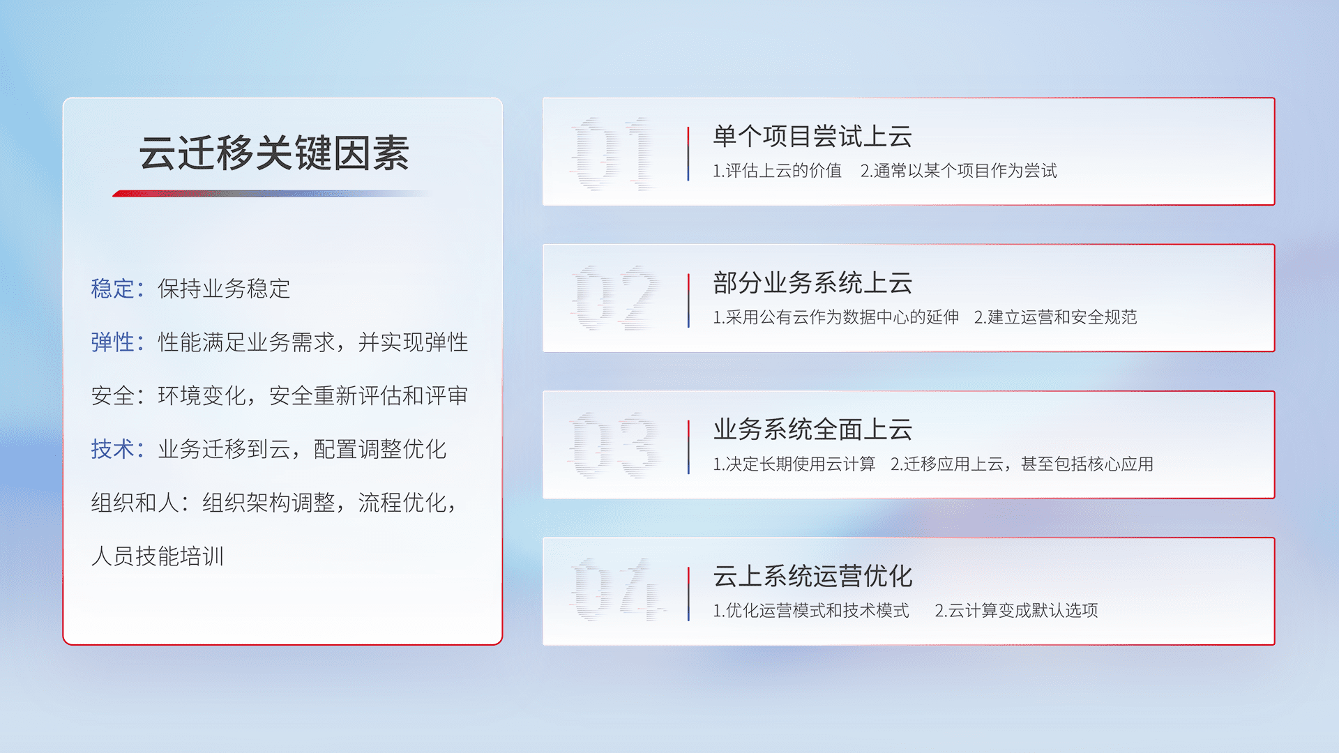 结合实际业务,,,,从规划设计、、、云平台选型、、云原生改造、、数据迁移、、、、集成交付,,迁移全过程为客户识别最佳上云路径,,做好风险识别管理,,,设计网络架构、、、身份权限、、、、安全审计合规、、操作审计、、、、日志审计、、监控告警策略、、多站点容灾设计等,,,,对云上基础设施进行整体规划,,,,提升IT治理水平,,,,以满足弹性、、高可用、、高性能的需求。。