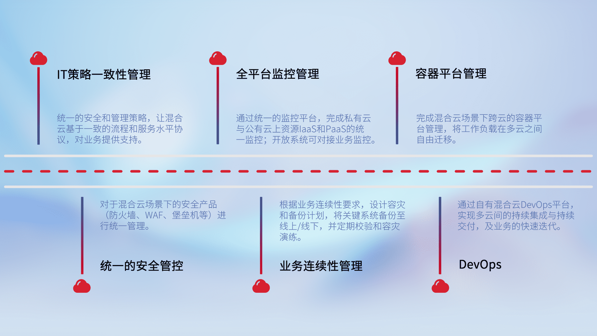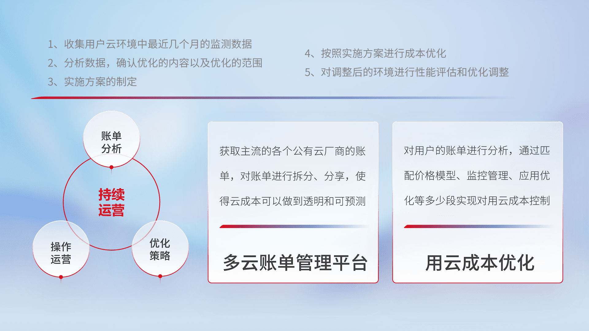 通过多云纳管,,,以统一的资源数据模型把客户的云资源进行抽象和封装,,,进而实现对多云资源的统一操作,,保障云资源管理的可靠性、、、稳定性与可用性。。量身定制化运维内容,,,,配置、、、、开发运维、、补丁管理、、、备份、、监控、、认证和访问管理、、、、审计和日常巡检等,,,保障在用云过程中的可靠度,,,稳定度以及高可用率。。